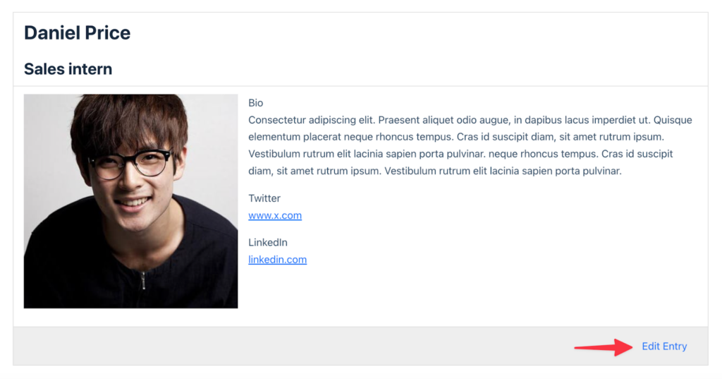 Now, when a logged-out user views an entry on the front-end, they will be able to see a link to edit the entry (provided the Link to Edit Entry field has been added to the View).