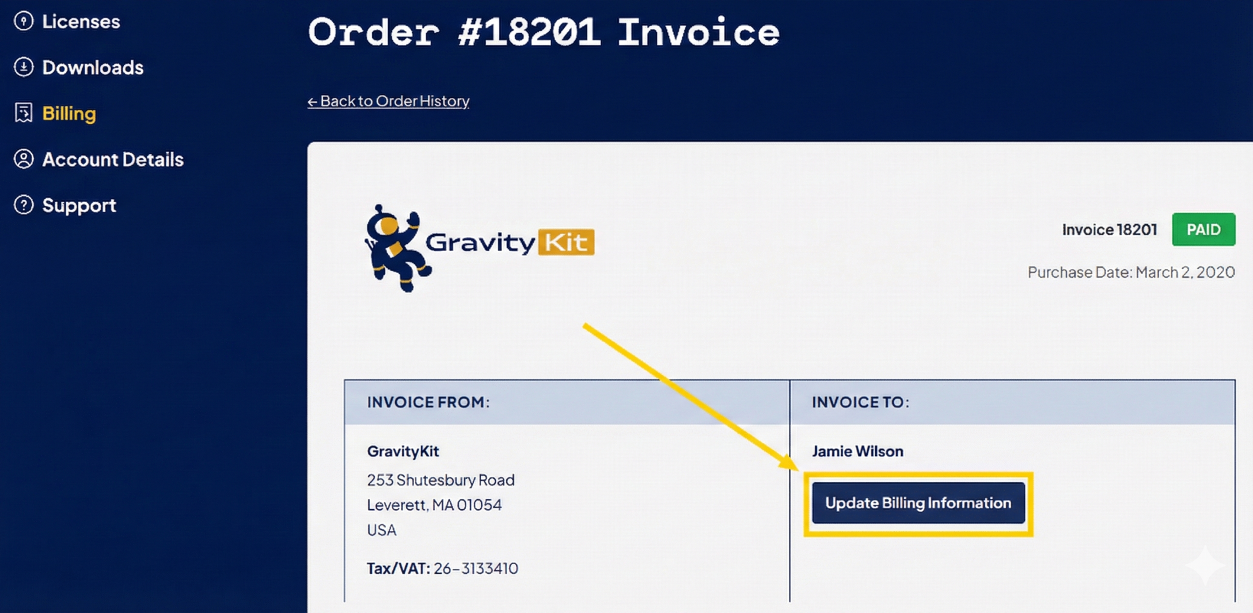 Need to add your company name, VAT number, or update your billing address on a GravityKit invoice?