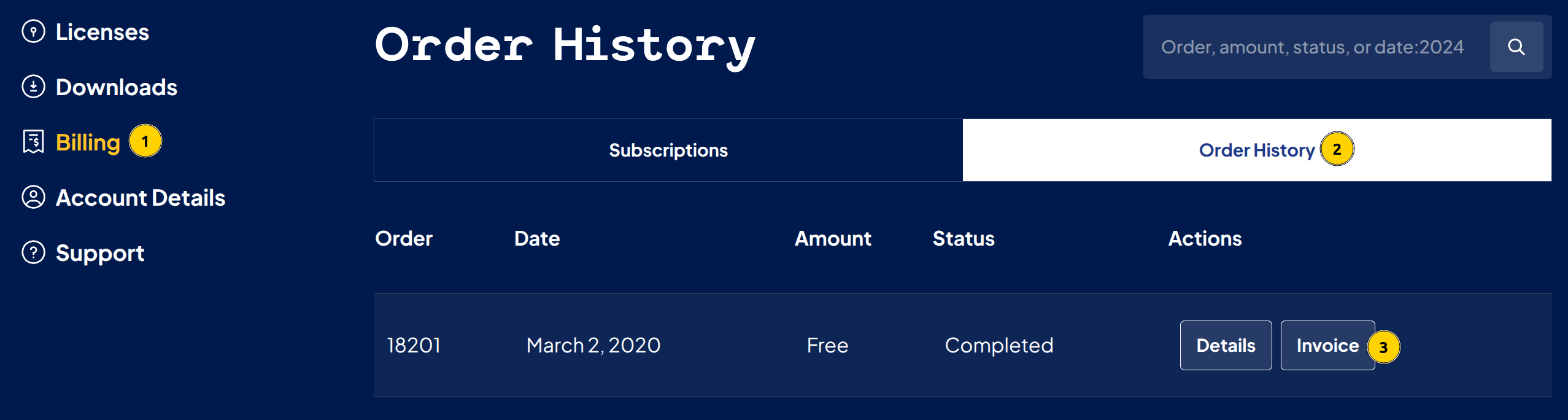 Log in to your GravityKit Account and click Billing in the sidebar. Then click the Order History tab to see all your past orders.