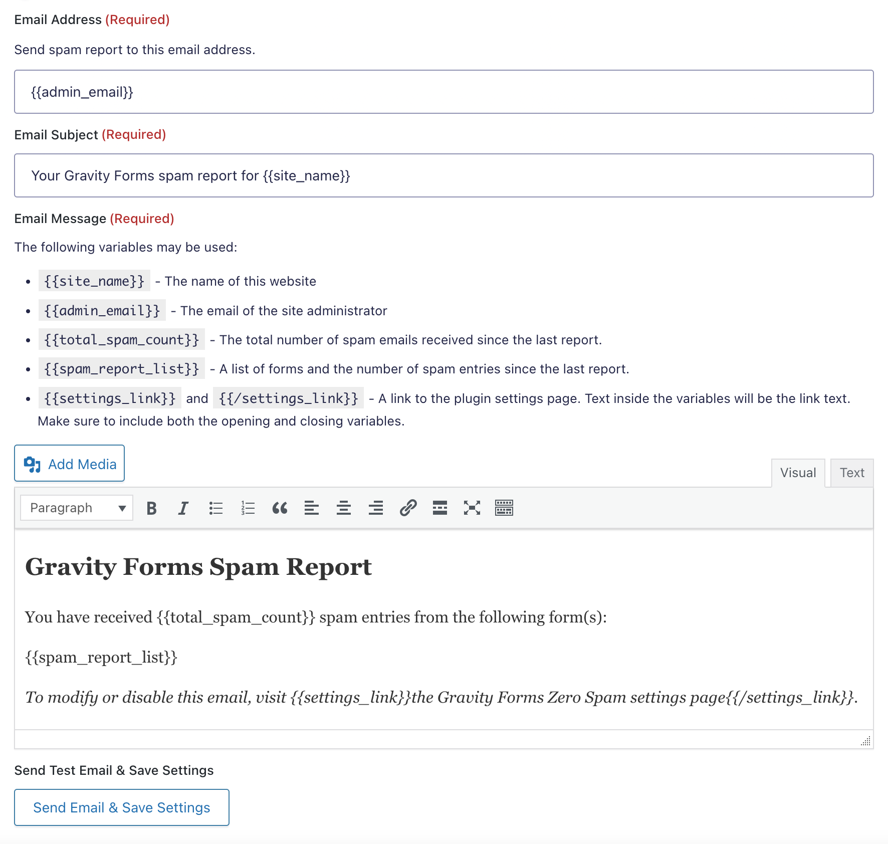Gravity Forms Zero Spam also enables you to receive automated spam reports over email. To enable this feature, hover over “Forms”, click on “Settings”, and then click on “Zero Spam”. Next, scroll down to “Spam Report Email” and choose how often you would like to receive spam reports.