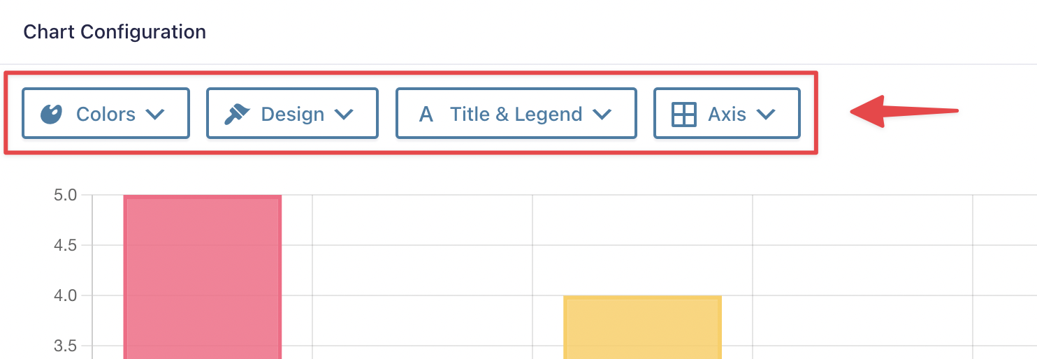 After editing your GravityCharts feeds, You’ll find the style options in the Chart Configuration panel above the chart preview. There are four design menus – “Colors”, “Design”, “Title & Legend”, and “Axis”.