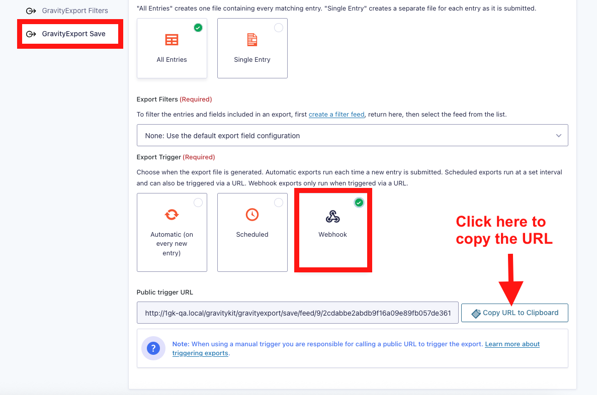 You can trigger a GravityExport Save feed in two ways: by scheduling it to run automatically at a set interval, or by calling a public trigger URL (webhook).