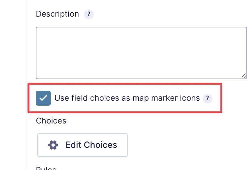 Now click “Edit Choices”. You’ll see an image icon next to the choice label. Clicking on this will allow you to select or upload your own custom map marker icon.