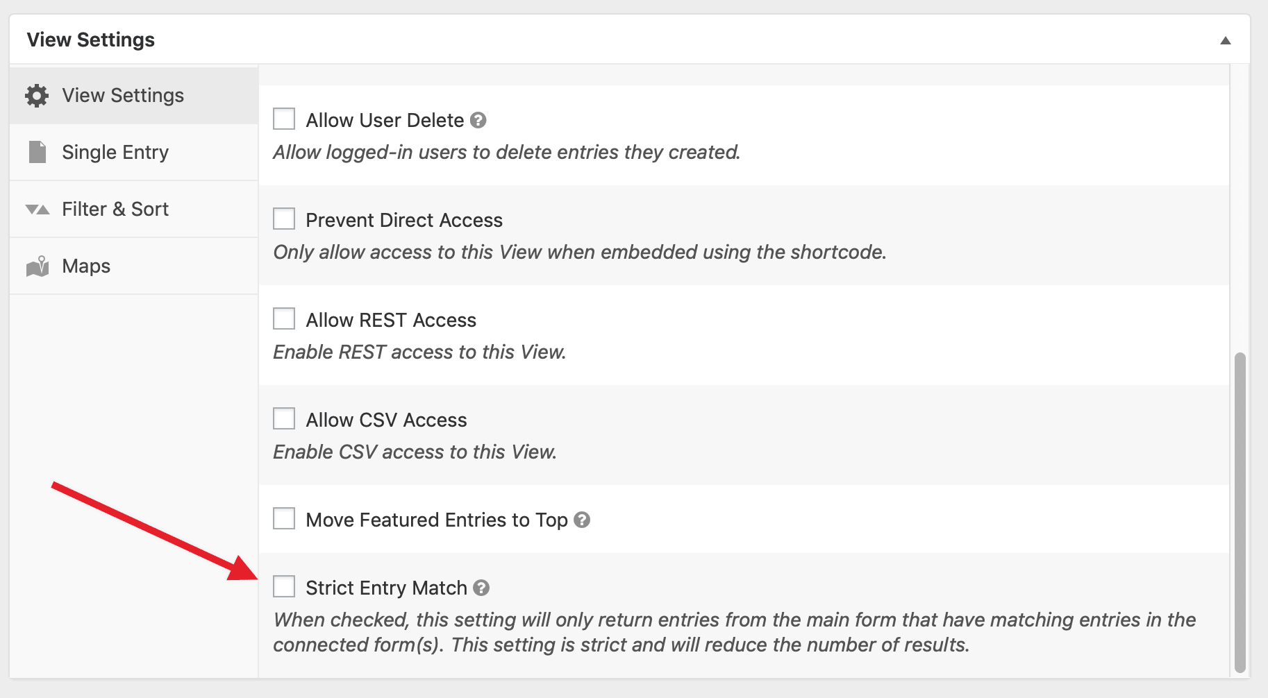 The plugin adds a setting called “Strict Entry Match” to the View Settings box. It looks like this: