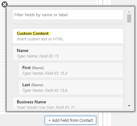 For the field you wish to display the percent sign next to, insert that field’s Merge Tag into the Custom Content box followed by the percent sign like so: