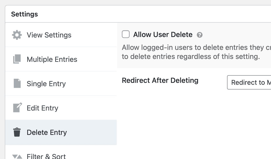- Change who can view the link – by default, the Entry Creator can view the link if “Allow User Delete” is enabled. You can change this so only users with more permissions can view the Delete Entry link.