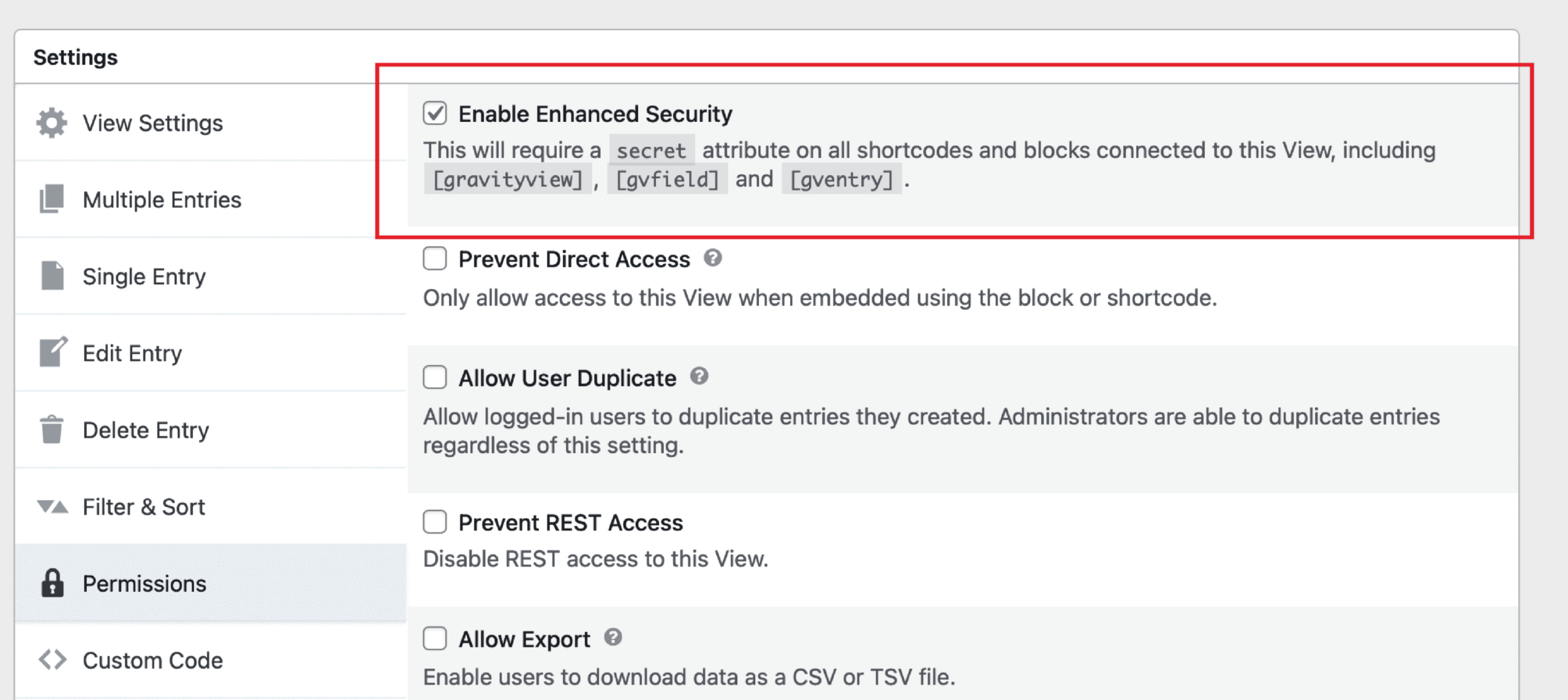 When this setting is enabled, all shortcode instances of [gvfield] ย ย and [gventry] ย ย based on a View with this setting enabled will also require the secret attribute.