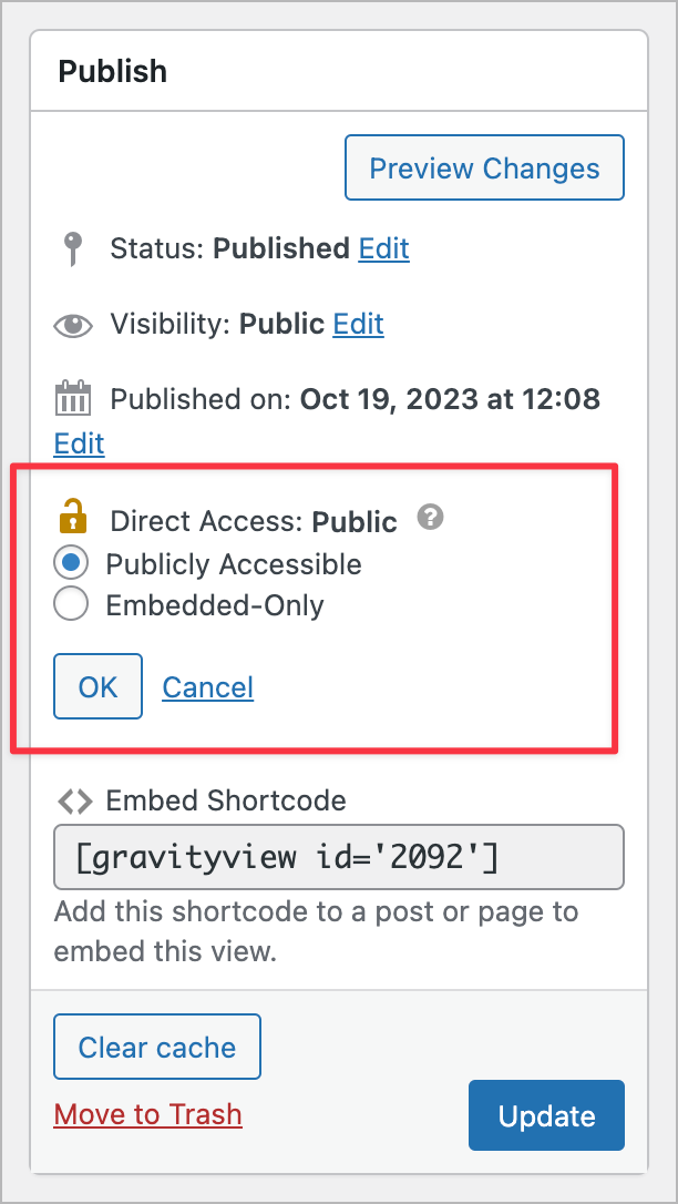 In the โPublishโ metabox in the GravityView View editor, there is an option to modify the direct access settings for the View. Clicking on the โEditโ link here will allow you to select between two options: โPublicly Accessibleโ (default) or โEmbed-onlyโ.ย