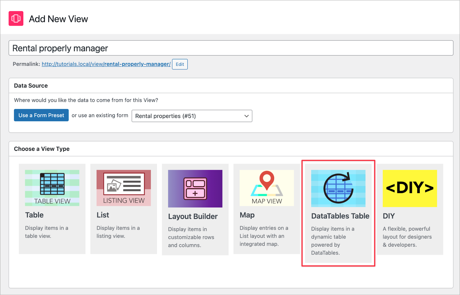 Now for the fun part—displaying all this data on the front end. We’ll hover over GravityKit in the sidebar and click New View. Next, we’ll select our “Rental properties” form as the data source, and choose the DataTables Table layout.