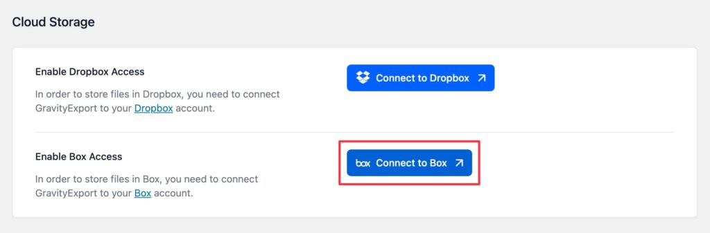 Simply connect to your Box account from the GravityExport settings (under GravityKit > Settings > GravityExport), and then select Box as the storage destination in your Save feed.