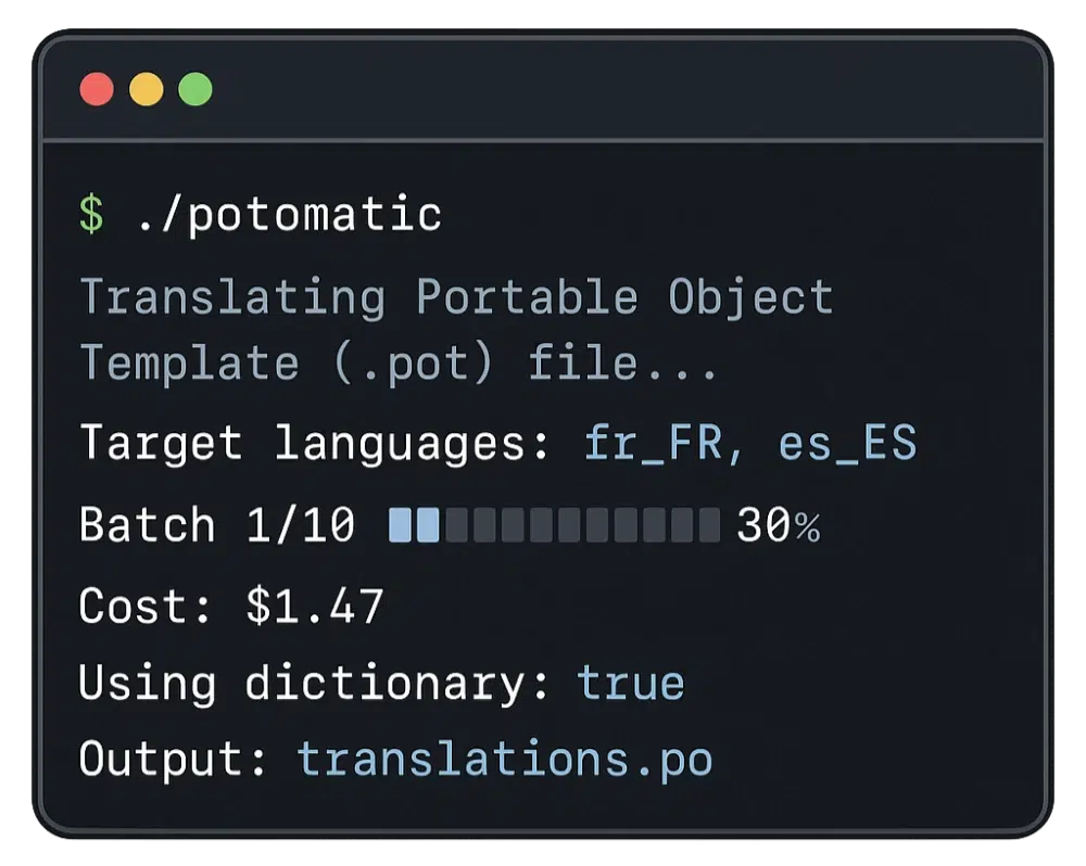 Accelerate your plugin or theme’s global reach. Potomatic is a fast, intelligent CLI tool that translates .pot files into any language supported by OpenAI.