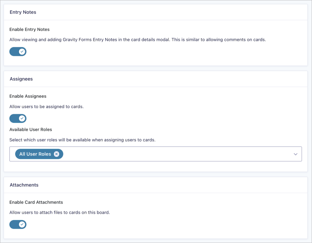 After mapping our form fields, we can select which board features to enable. GravityBoard supports entry notes (comments and mentions on individual cards), assignees (assign users to cards), and attachments (upload file attachments to cards).